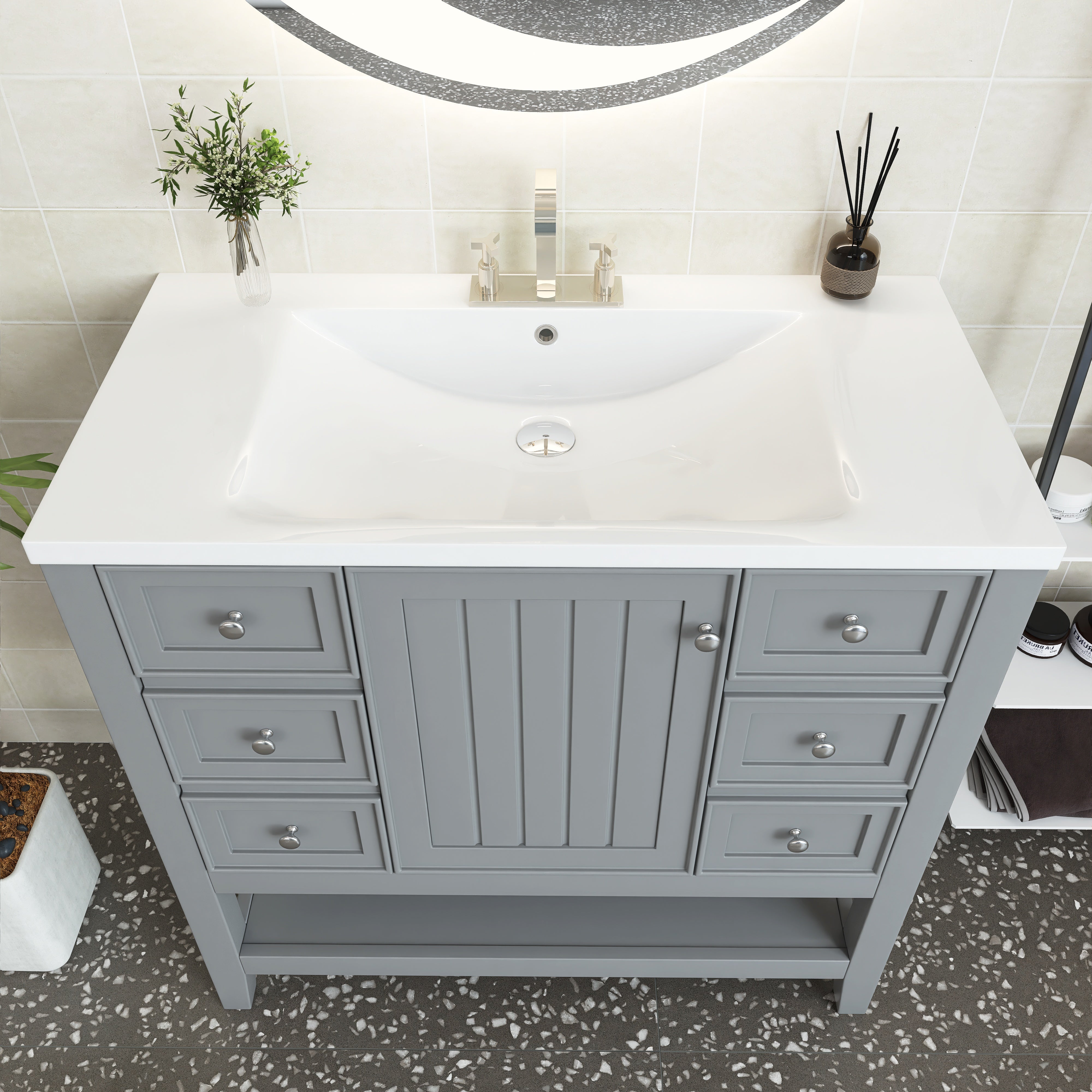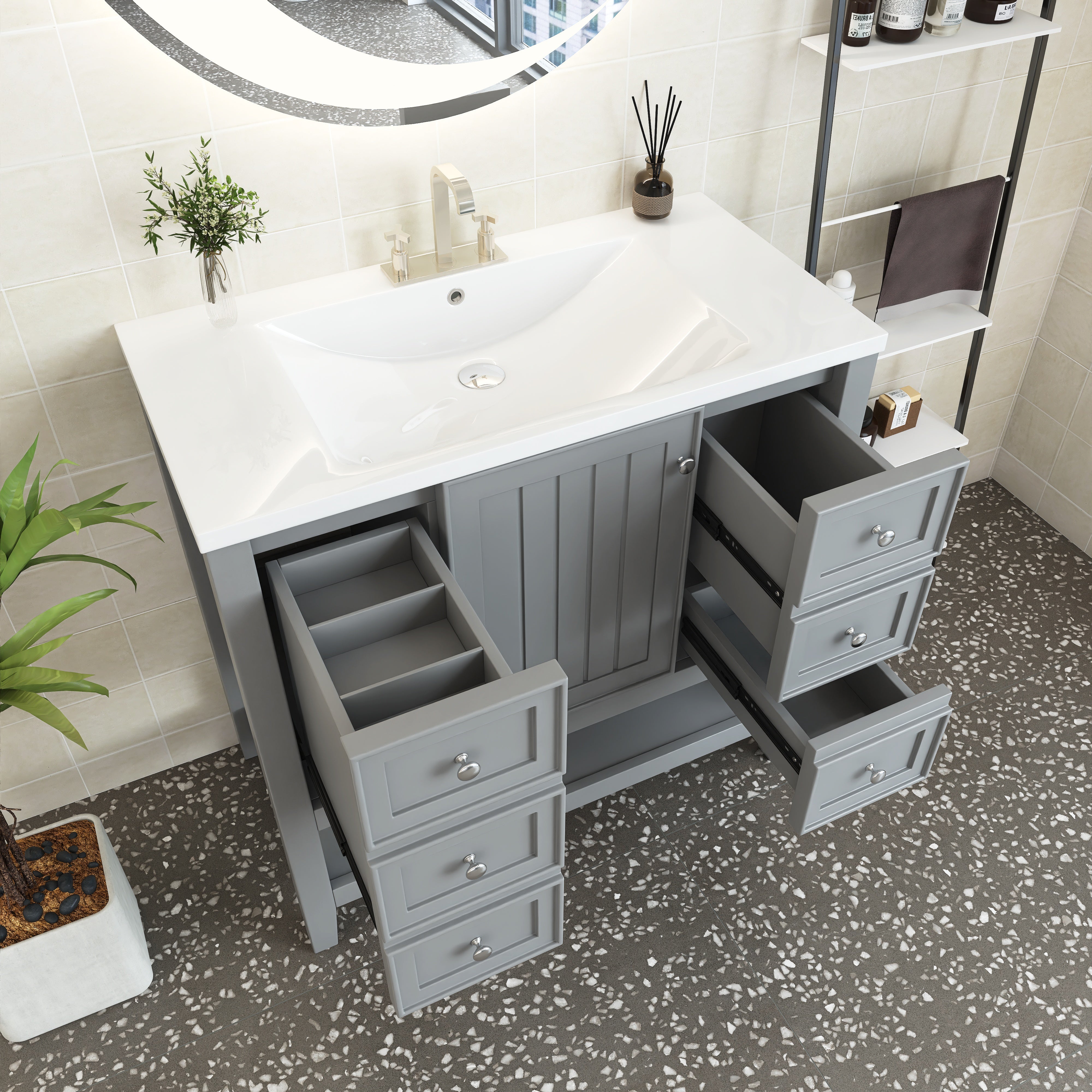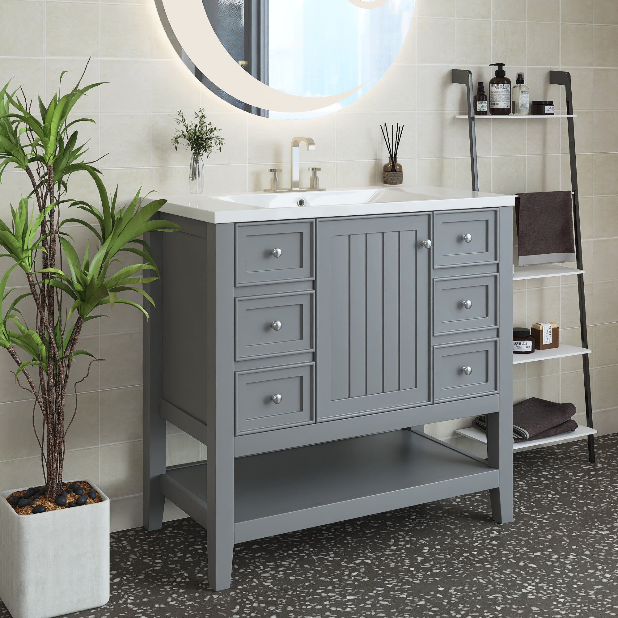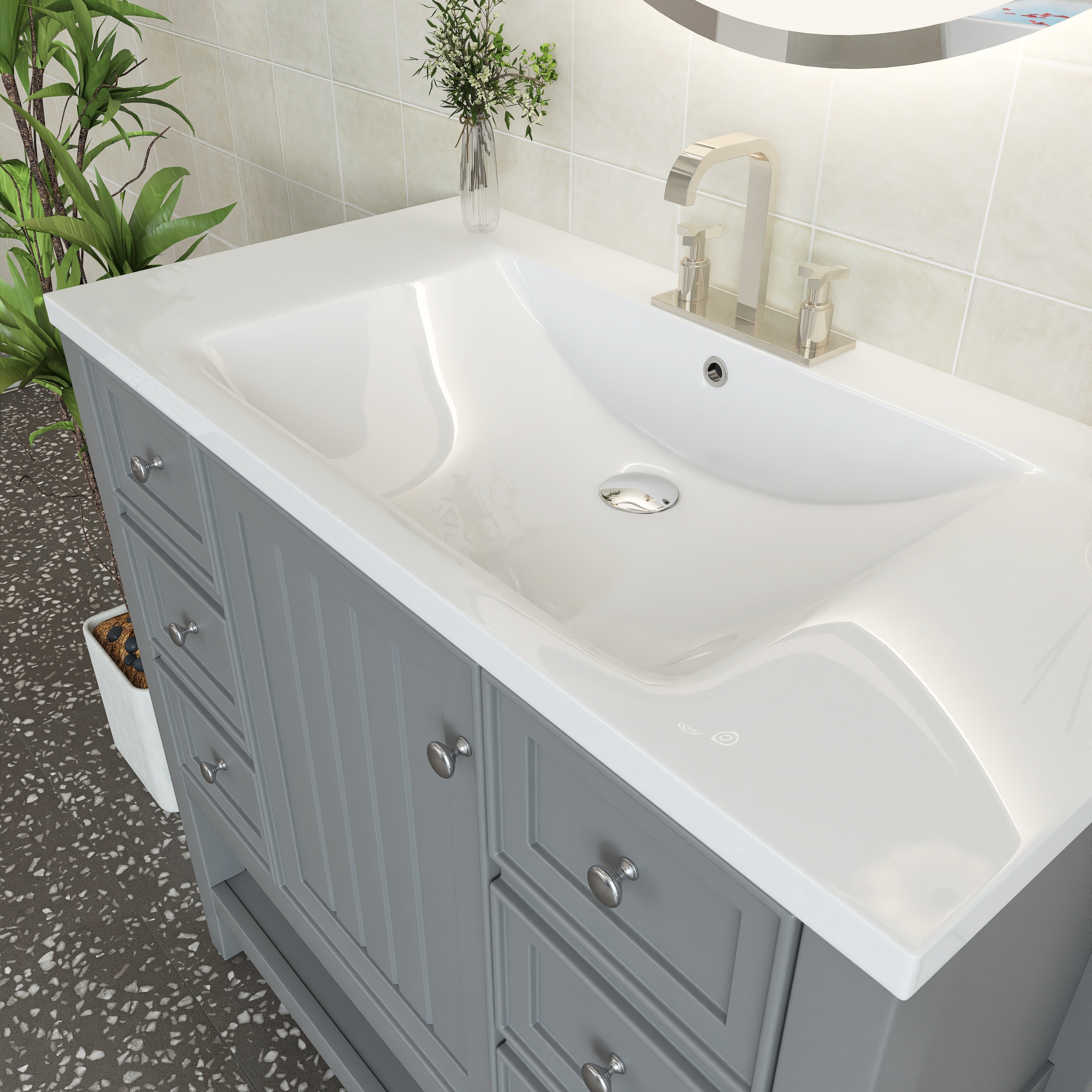 [Bathroom Vanity with Sink] Easy clean and grand with the integrated sink made of premium ceramic, solid and durable. Features an overflow hole that prevents water leaks and spills. For your convenience, we have predrilled a single faucet hole.