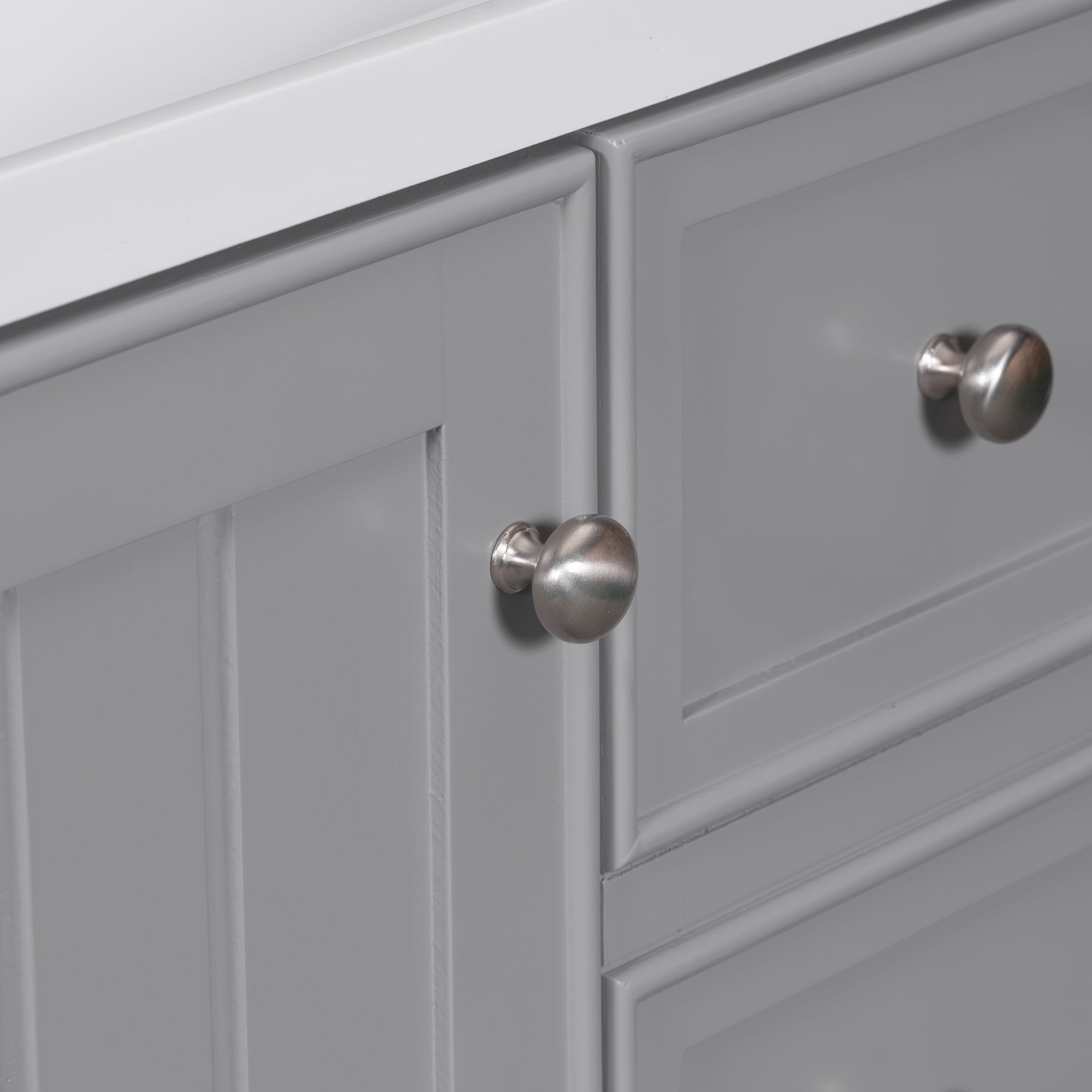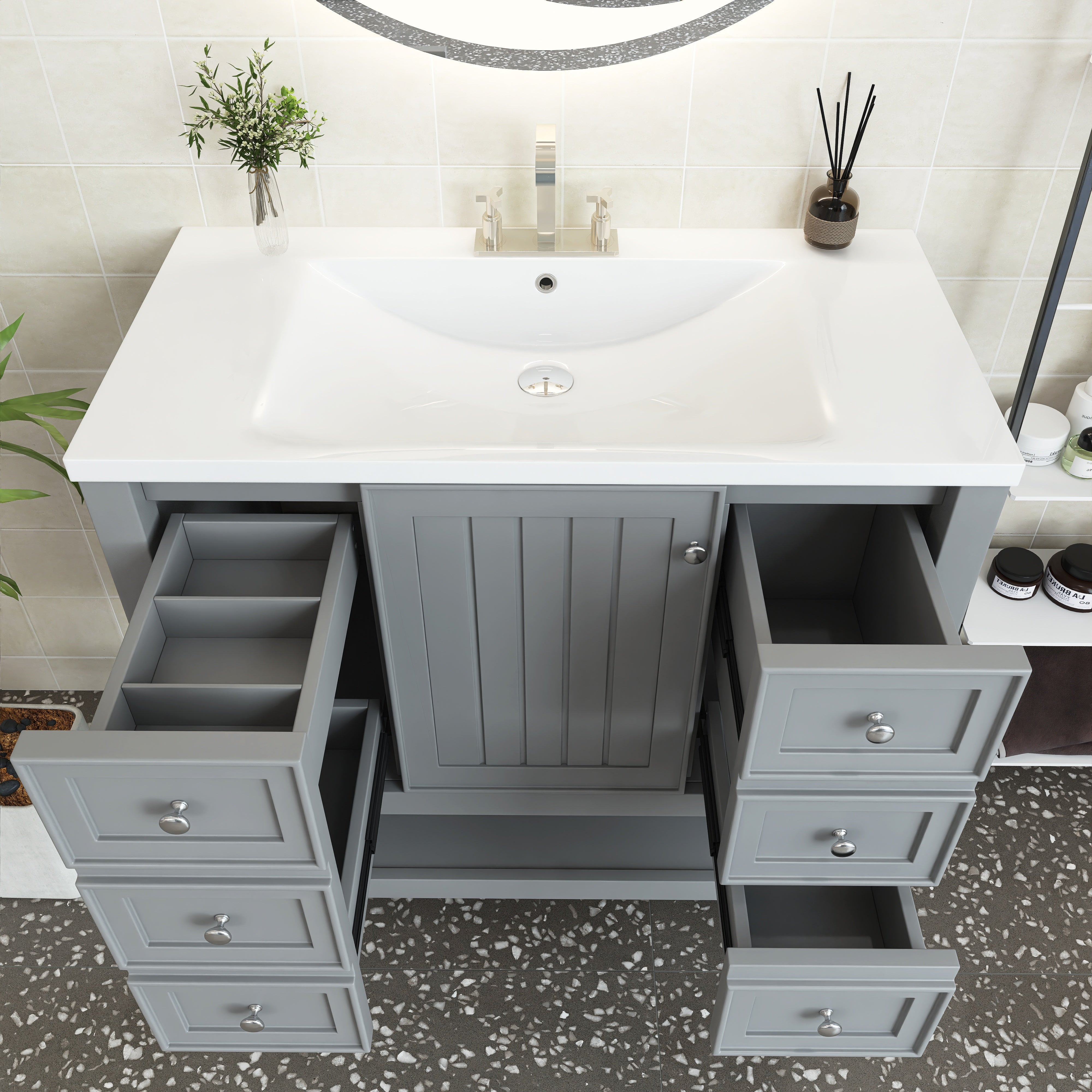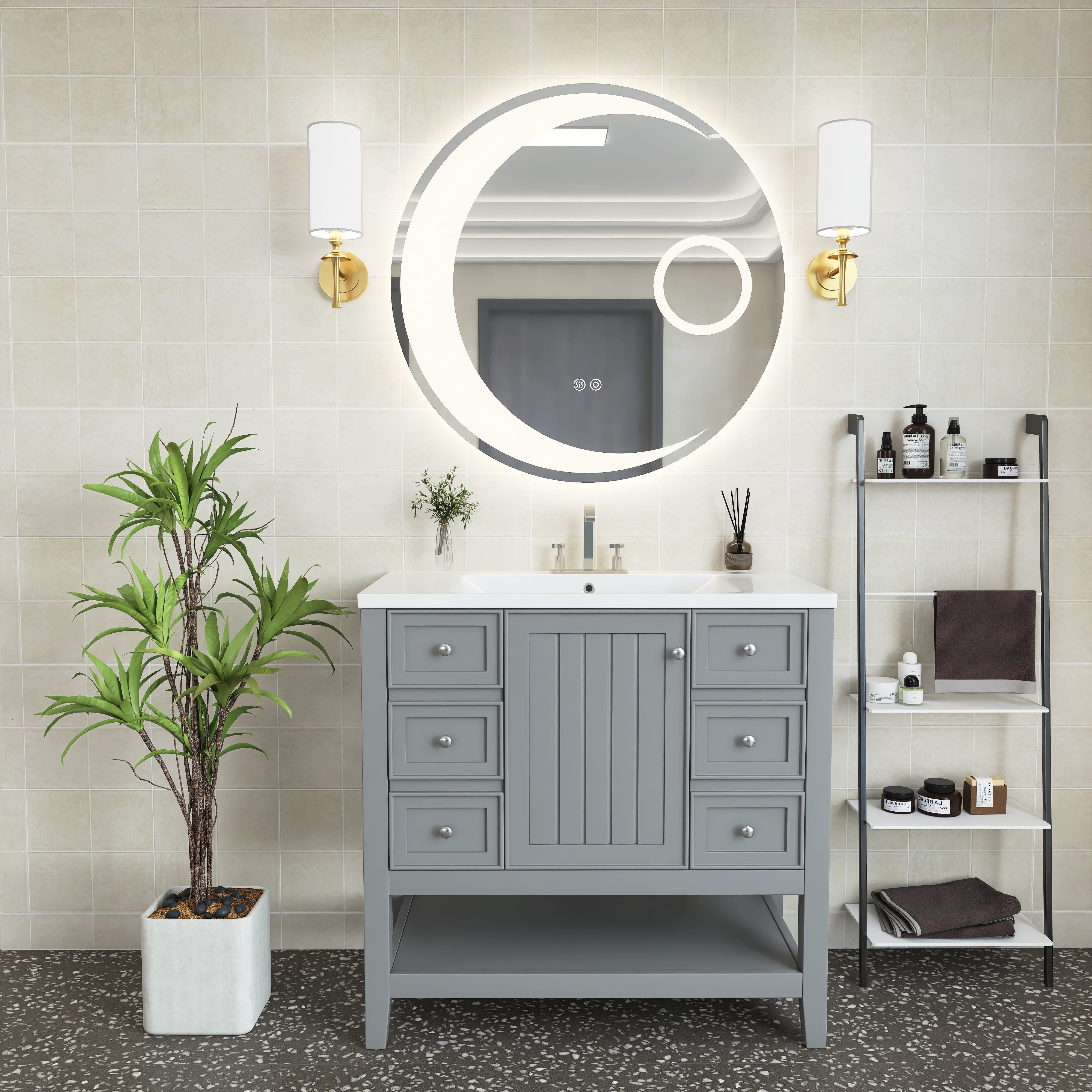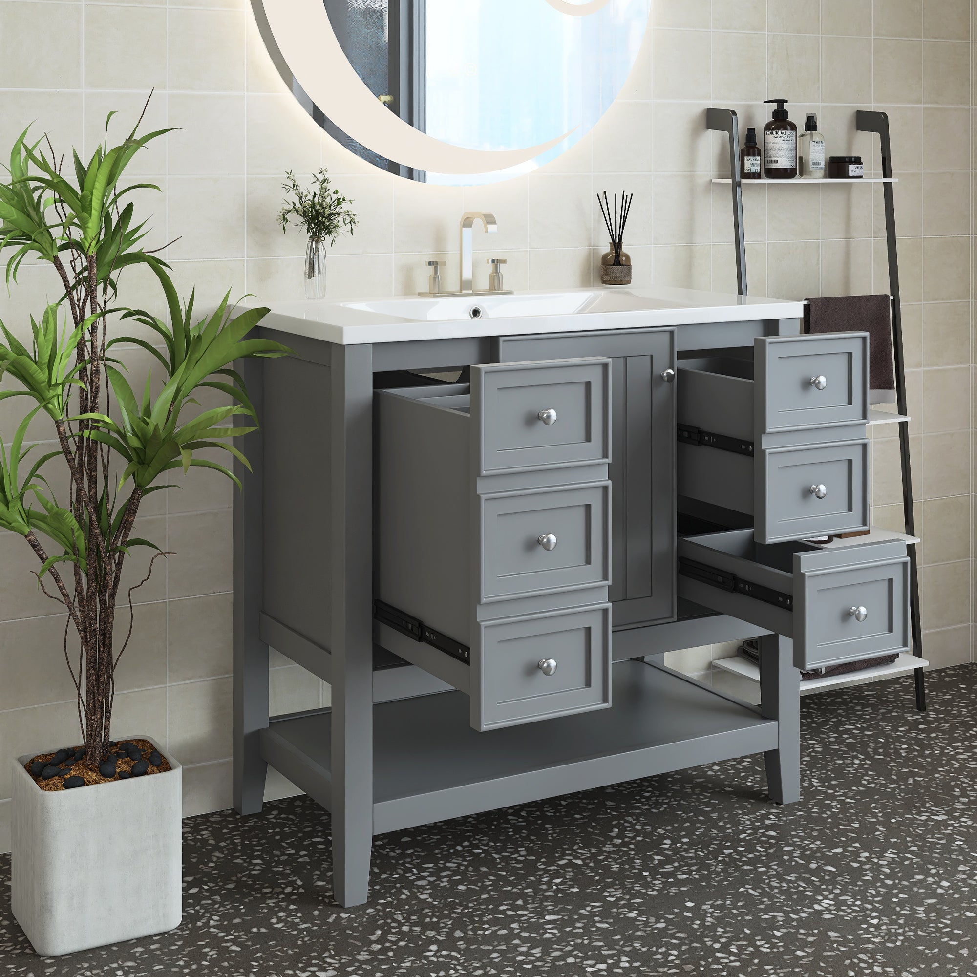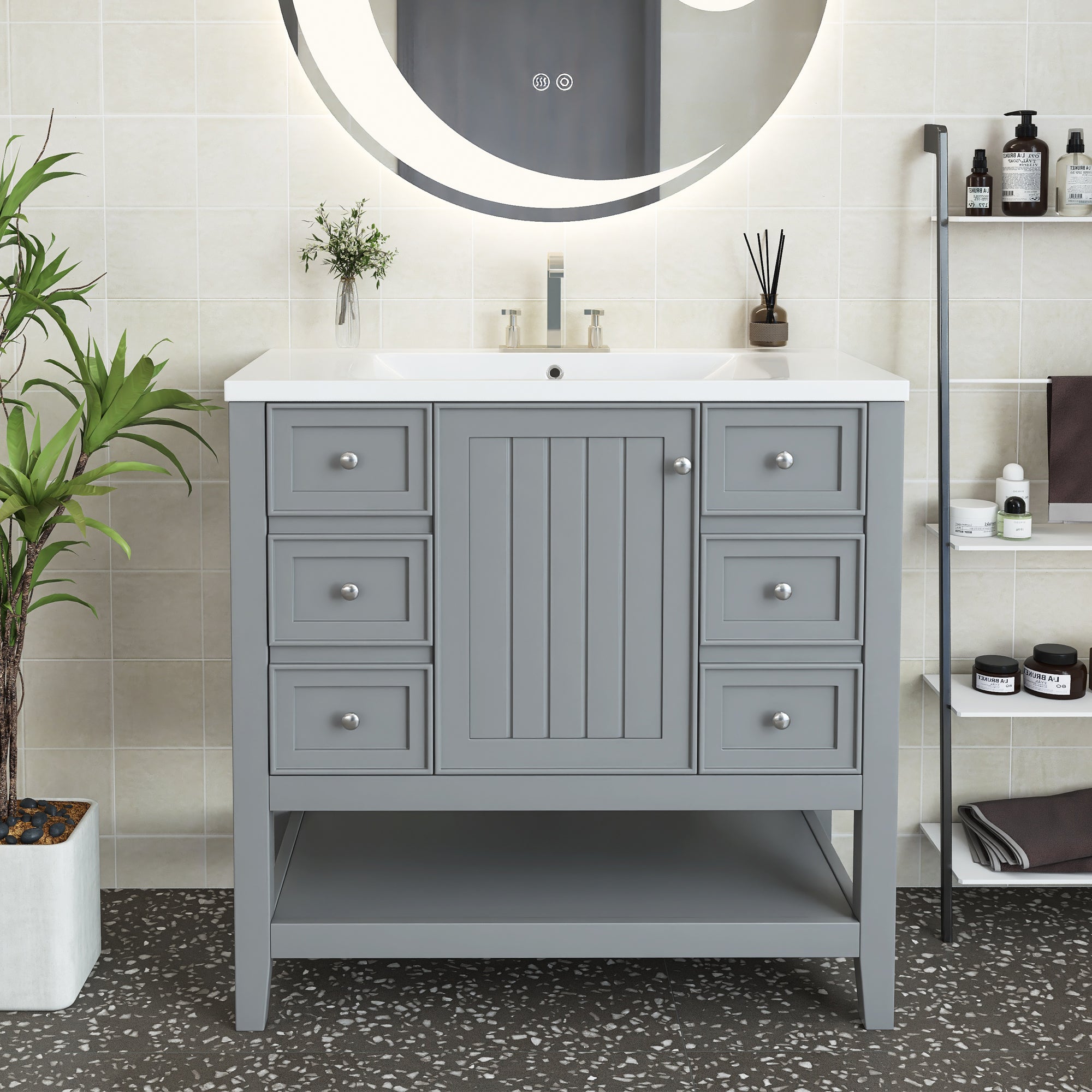 [Bathroom Vanity with Sink] Easy clean and grand with the integrated sink made of premium ceramic, solid and durable. Features an overflow hole that prevents water leaks and spills. For your convenience, we have predrilled a single faucet hole.